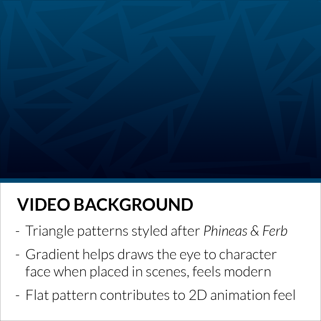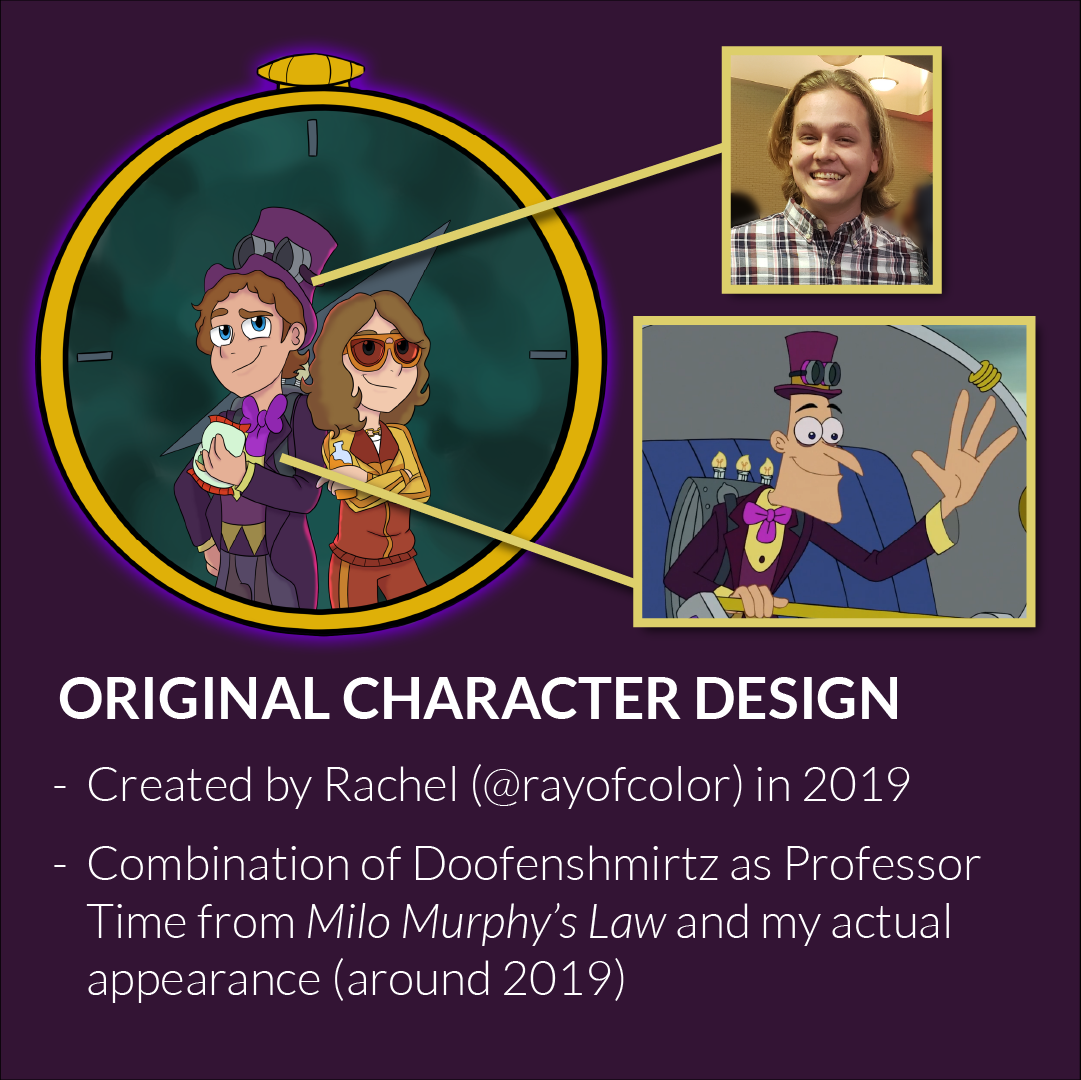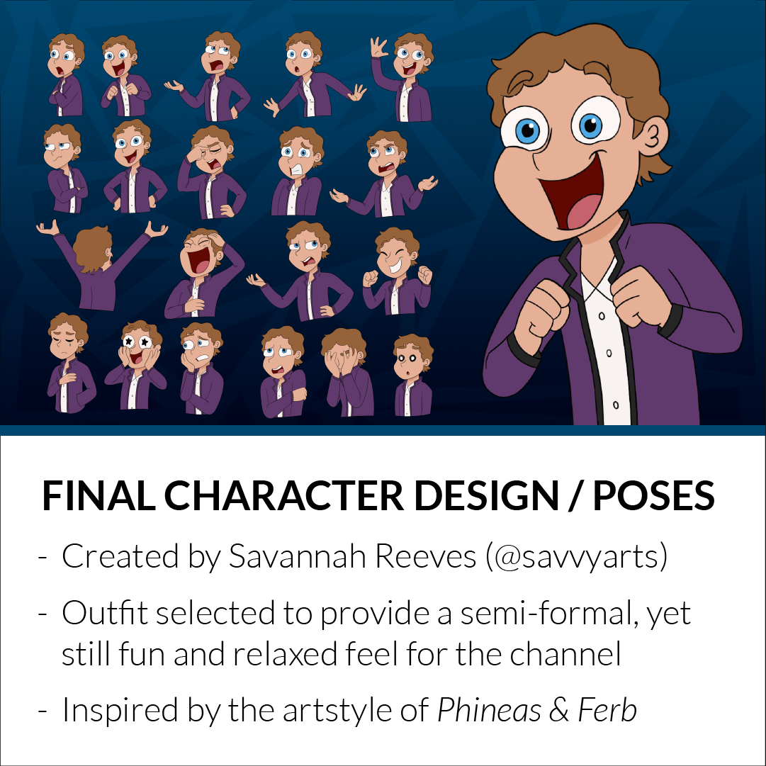 I wanted a modern-feeling 2D aesthetic, leaning into the idea of portal-hopping and jumping through dimensions. Additionally, I wanted hints of the Phineas & Ferb inspiration. I commissioned Savannah Reeves to develop a number of character poses for the channel, with my OC (original character) drawn in the style of a Phineas & Ferb character (original design by Rachel).