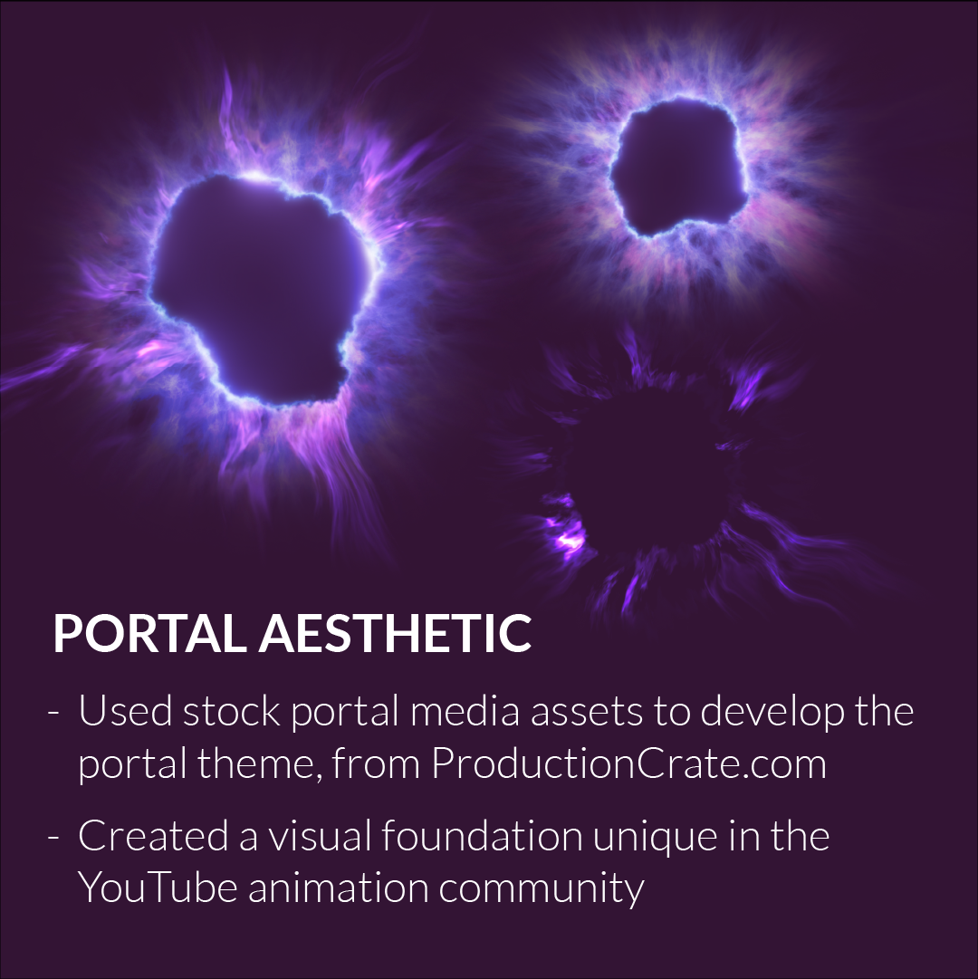 To support the portal motif, transitions between Animated and Live-Action segments in the videos are consistently done via portal. Additionally, each video ends with the portal closing before the final logos.